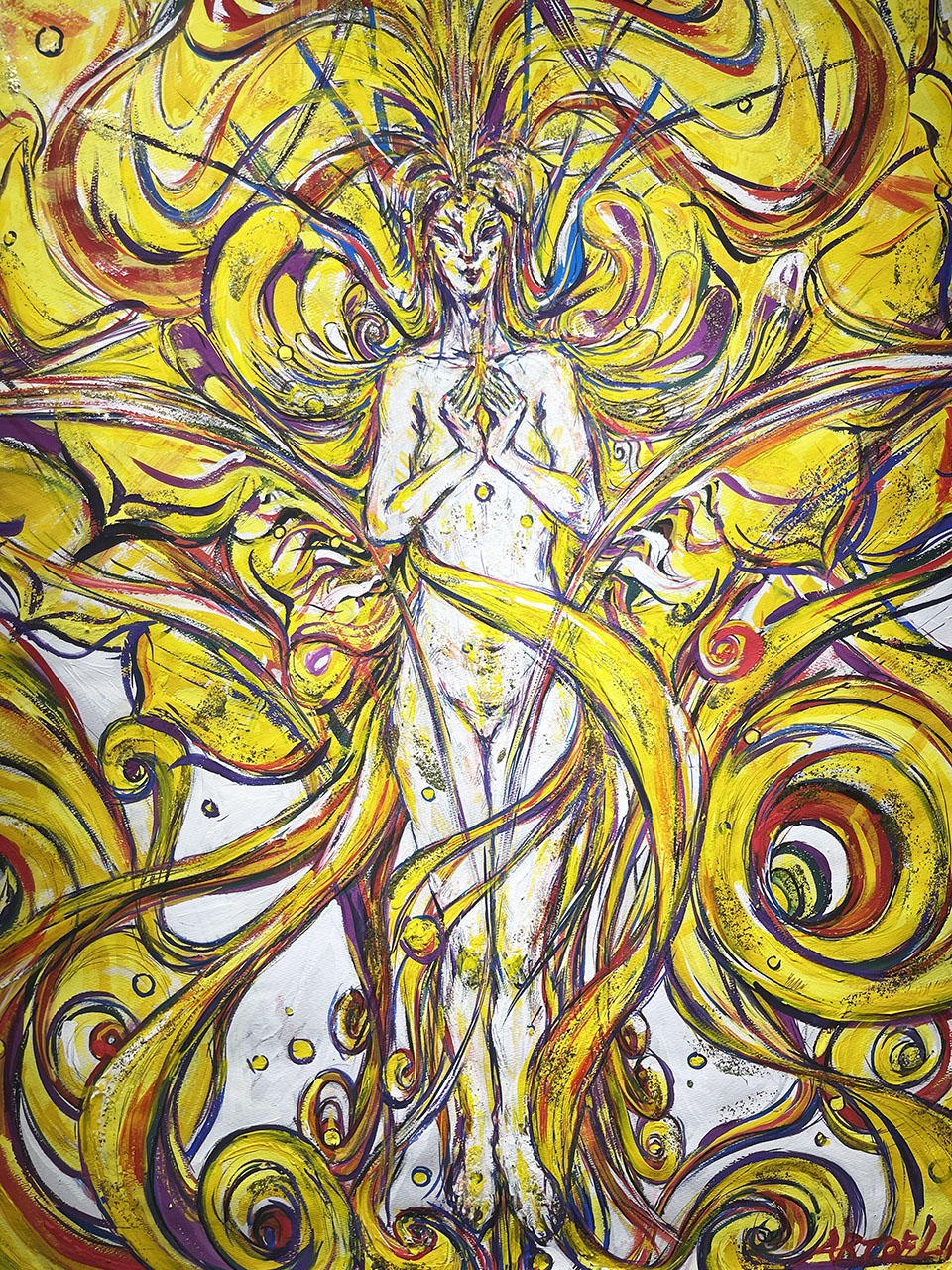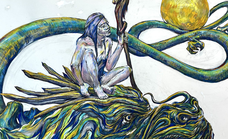 神話や自然、人の内面をモチーフに、アクリル画・水彩画・水墨画など多彩な表現で制作しています。作品一覧はこちらからご覧いただけます。